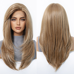 Stock Lange Rechte Blonde Gelaagde Synthetische Pruiken Met Zij Pony Pruik Voor Vrouwen Hittebestendig Haar